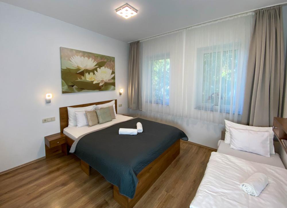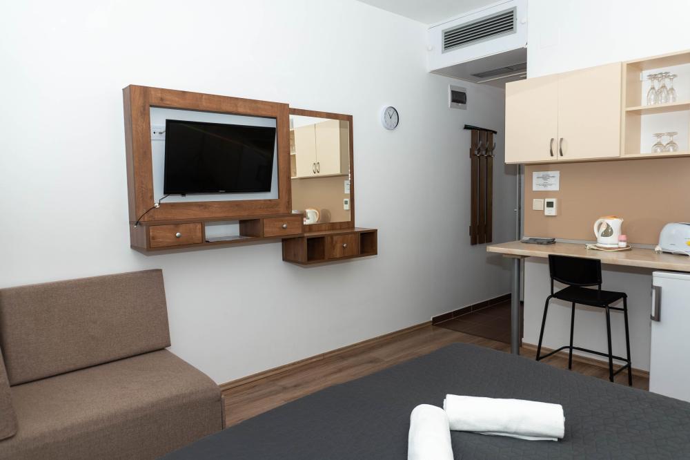 Alapvetően 2 fő részére foglalható, saját bejáratú stúdió apartman, mely egy hálótérrel, konyhasarokkal, zuhanyzóval ellátott saját fürdőszobával rendelkezik. Franciaágy, valamint egy 3. fő részére alkalmas fotelágy található a konyhasarokkal egy légtérben. Területe 22 m². Szállásunk 3 év alattiak részére díjmentes. Gyermekek részére utazó gyermekágy, etetőszék, fellépő, WC-szűkítő, konnektorvédő kérhető térítésmentesen.